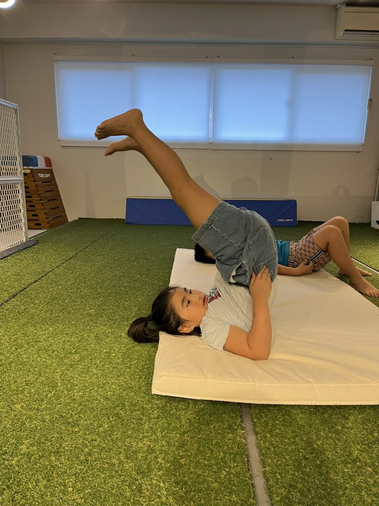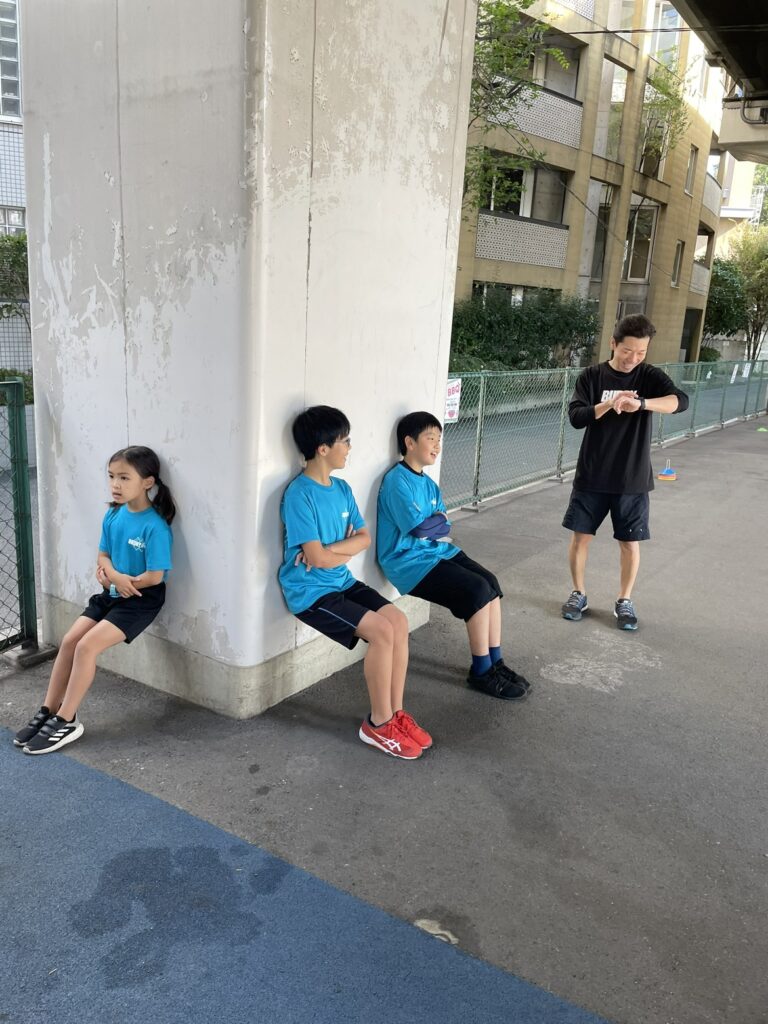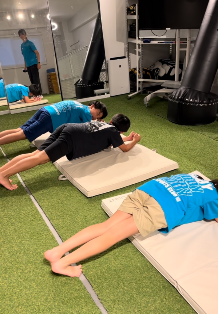 BUDDYキッズでは、毎回ルーティンとして、上体起こしや上体反らし、プランクのような体幹トレーニングから、座り立ちをある程度繰り返すスクワットのような動作も継続的に行っています💪