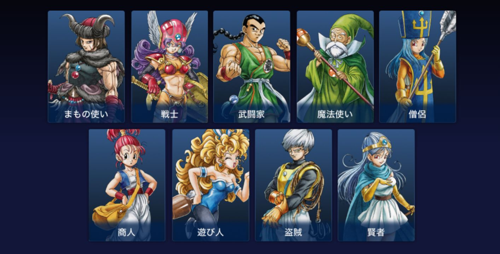 仲間の職業を自由に選べる「転職システム」が特徴です。戦士、僧侶、魔法使い、商人、魔物使い、遊び人、武闘家、盗賊、などの職業を組み合わせて、自分だけのパーティを作れます。
