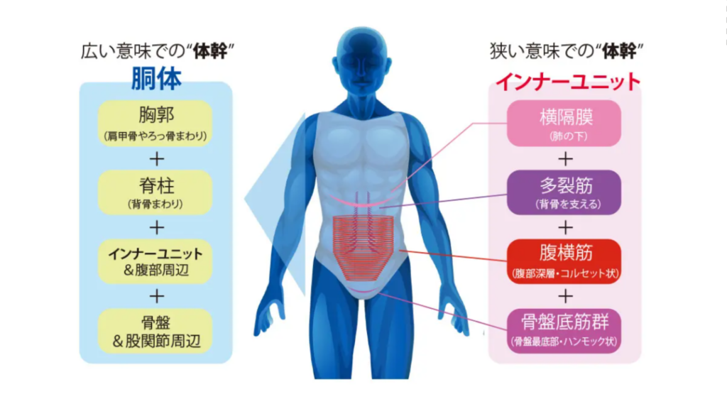 よく「腹筋」が体幹と思われがちですが、実は体幹には背中やお腹周りを含む多層の筋肉が複雑に存在しており、脊柱や骨盤を安定させる役割を担っています。