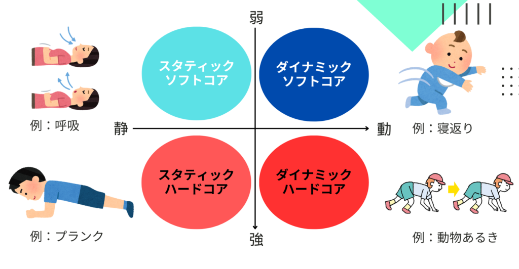 これは主に姿勢を維持するような体幹の深層にある筋群にアプローチする種目です。例えば深呼吸をするようなエクササイズがこれにあたります!最近の子供は住宅事情により、赤ちゃんの頃に泣く量が少なくなっていてそのため体幹の弱体化につながっている可能性も示唆されています。 - ダイナミックソフトコア(動的かつ負荷が低い)