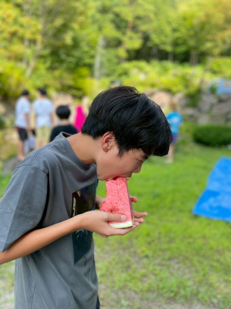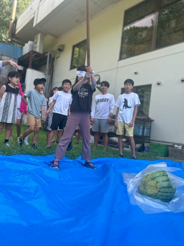 そして最終日の3日目はスイカ割り🍉 目隠しでぐるぐるされたお友達を、声だけでスイカまで誘導。最初は「右!右!」「そっちじゃない!!」なんてみんながそれぞれ曖昧なことを叫んでいました。ですが、「右に回って!」「右に3歩!」といった具体的な指示が飛び交い、見事スイカが割れました!とーっても甘くておいしいスイカでした😍お洋服がスイカの果汁で、、、なんてことは気にせず顔より大きなスイカを頬張りました。