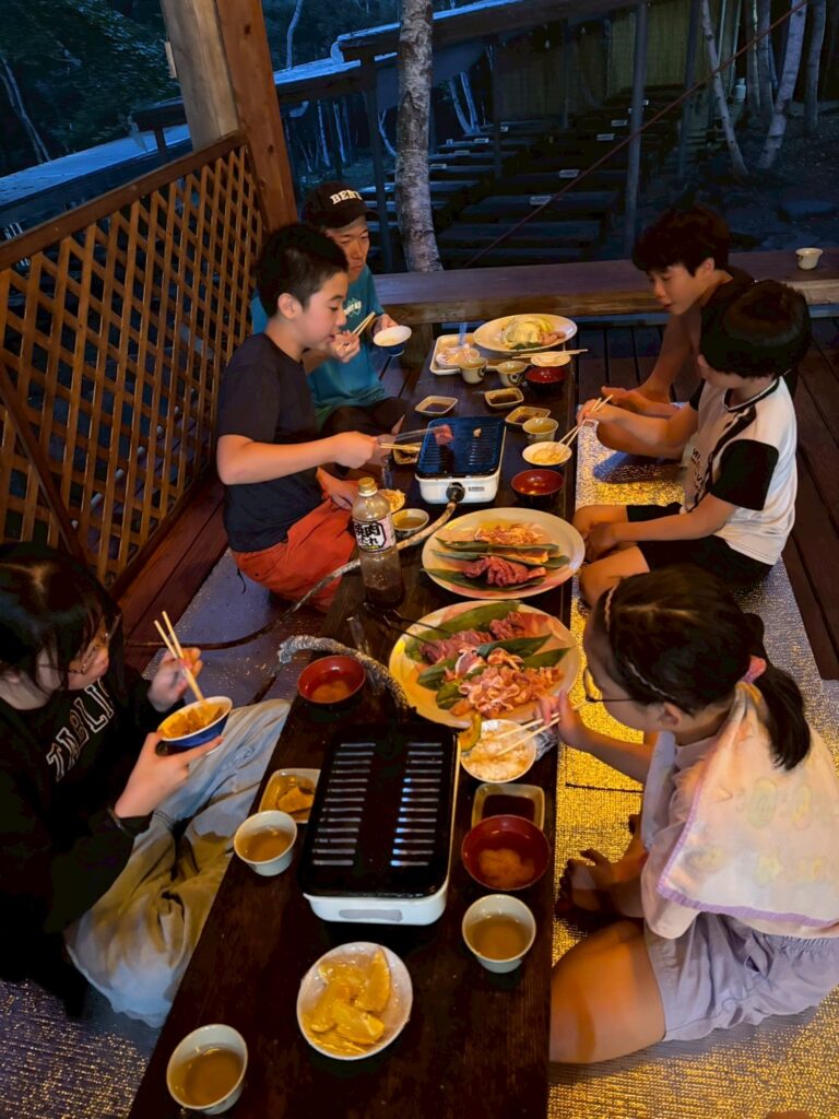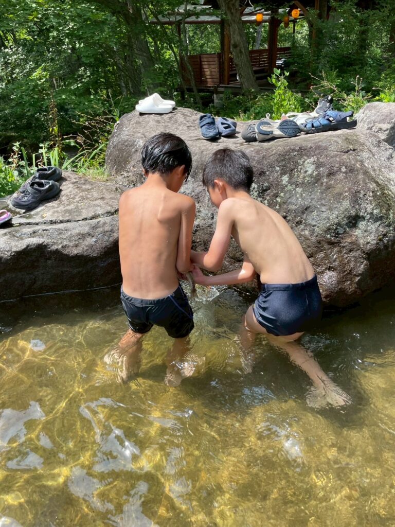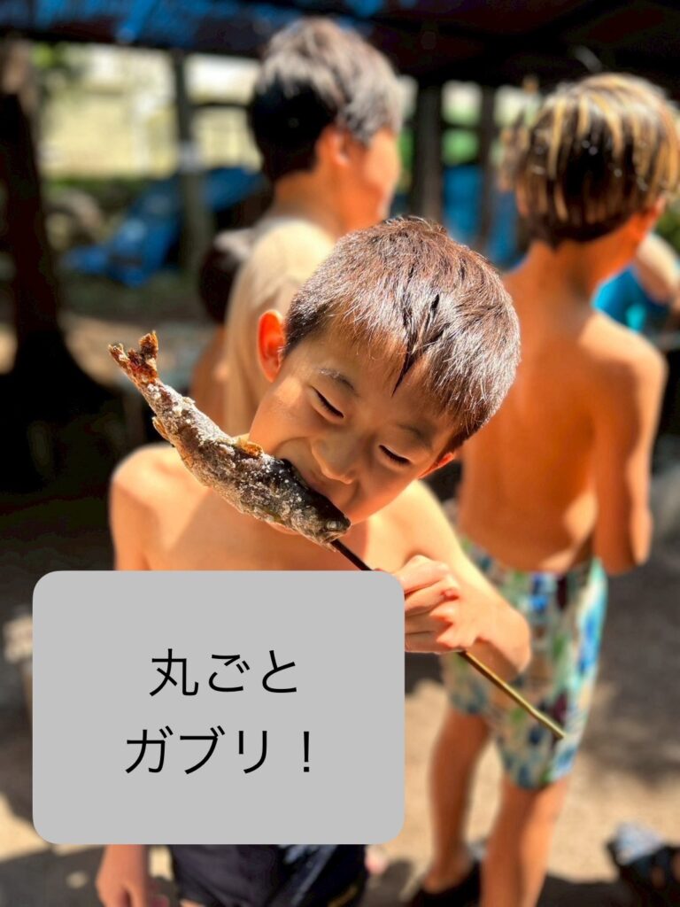 2日目は、お昼に魚のつかみ取り🐟&流しそうめん。魚を手で捕まえるの?!ってびっくりしてました。最初はおそるおそる魚に近づきます。でもすぐに気づいていました。魚が速すぎてそんなんじゃ捕まえられない!必死に魚を追いかけて1時間も奮闘していました。そしてしっかり全員分採ってくれました!自分たちでとったマスの塩焼きは最高にの味😋流しそうめんも争奪戦で大盛り上がり。お腹いっぱい食べました。