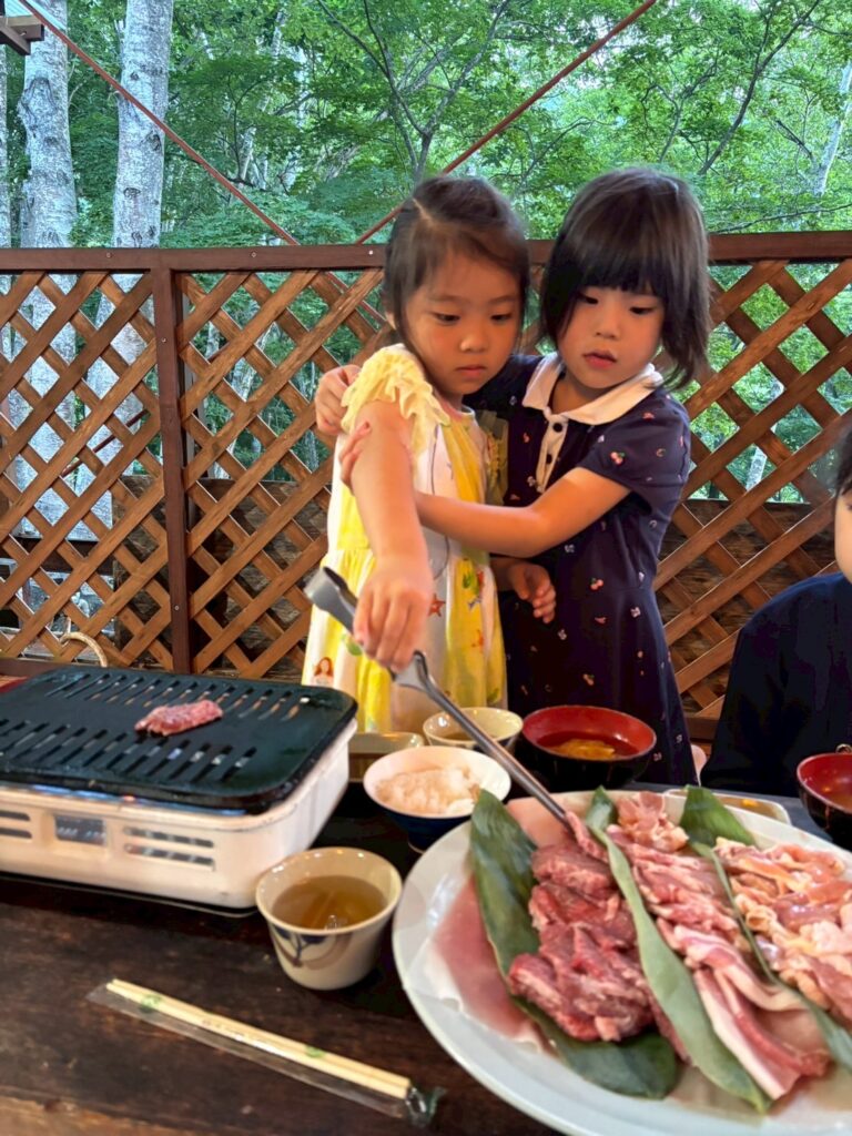 1日目の夜はBBQ🍖 3.4人ずつ席について、自分たちでお肉やお野菜を焼いて食べます。初めてのトングで、お肉を上手につかむのに苦戦しながらも、上手に網の上にのせて焼いてくれました😊